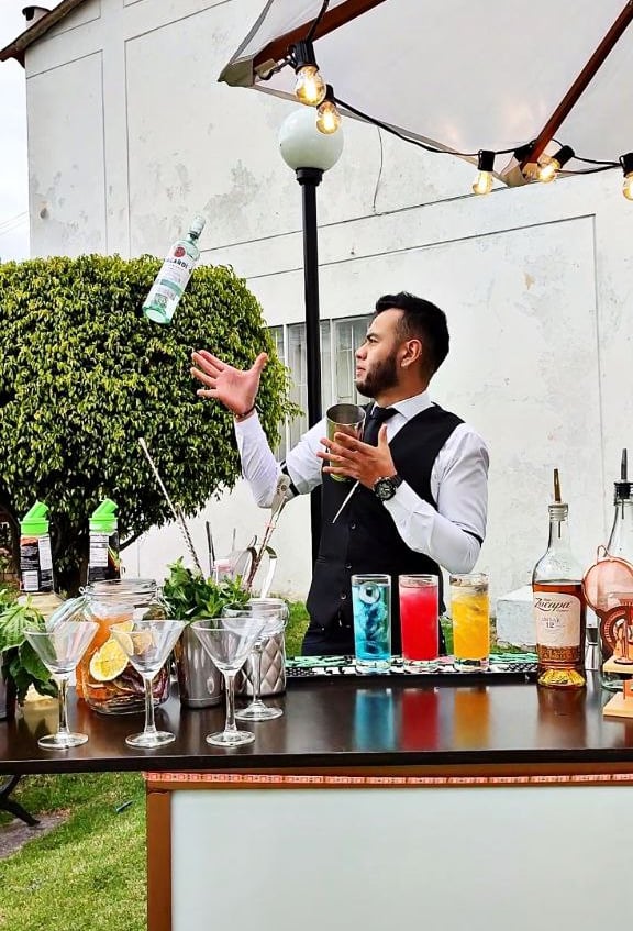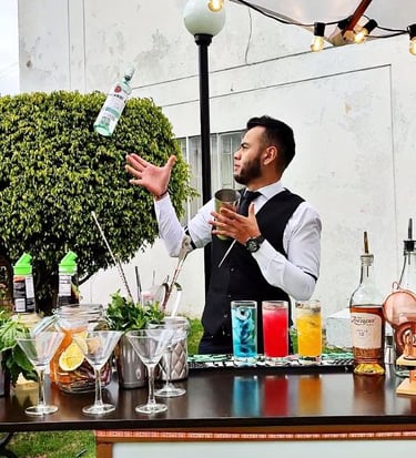 Bartender profesional, servicio de coctelería con welcome drink o brindis de lujo, bebidas limitadas por cinco horas con o sin alcohol, cristalería, barra móvil adecuada a tú espacio y un espectacular show de flair.